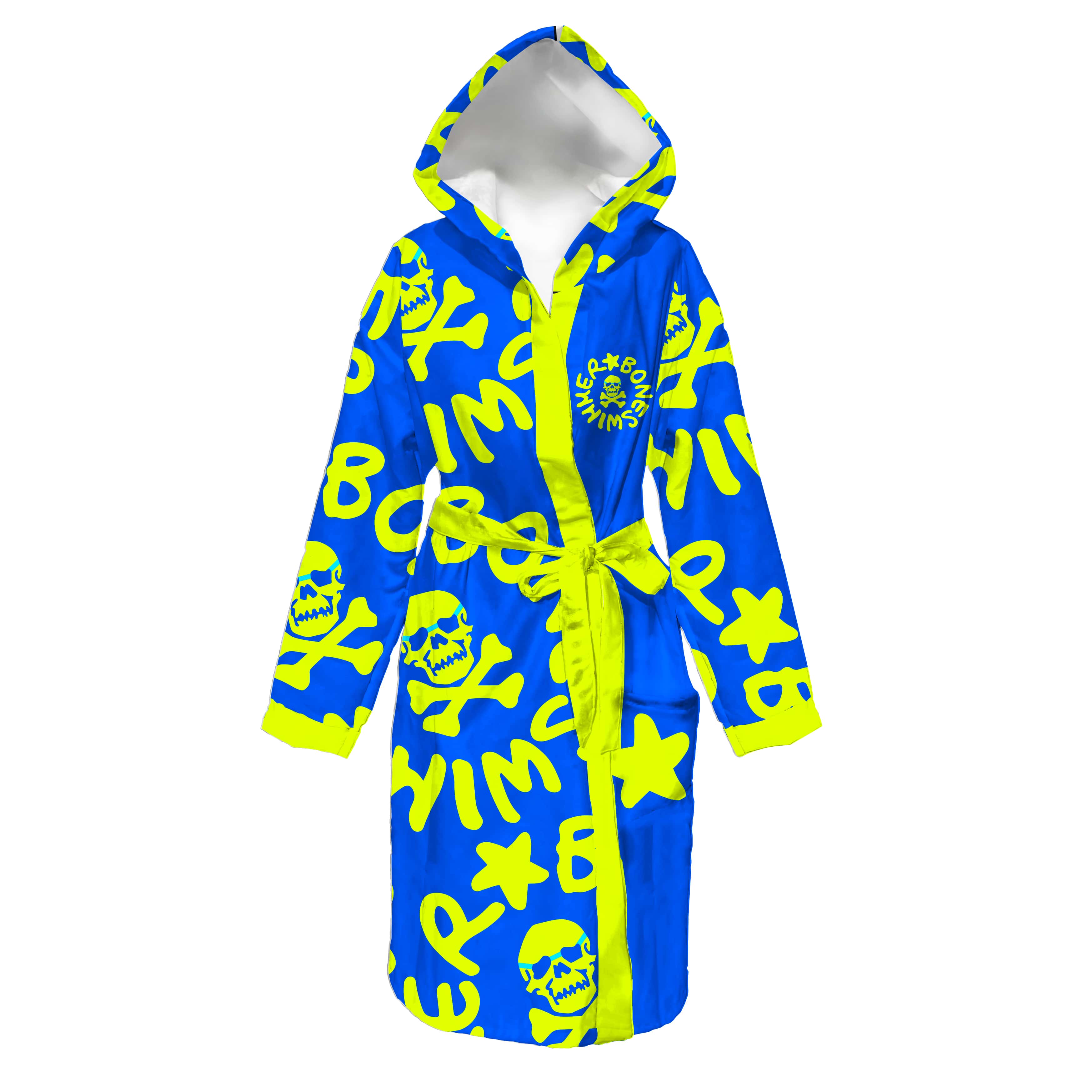 Badeumhang für Kinder aus Mikrofaser von BONESWIMMER, türkisfarben mit gelbem Logo. Weich, leicht und sehr saugfähig, ideal zum schnellen Abtrocknen nach dem Training im Schwimmbad.