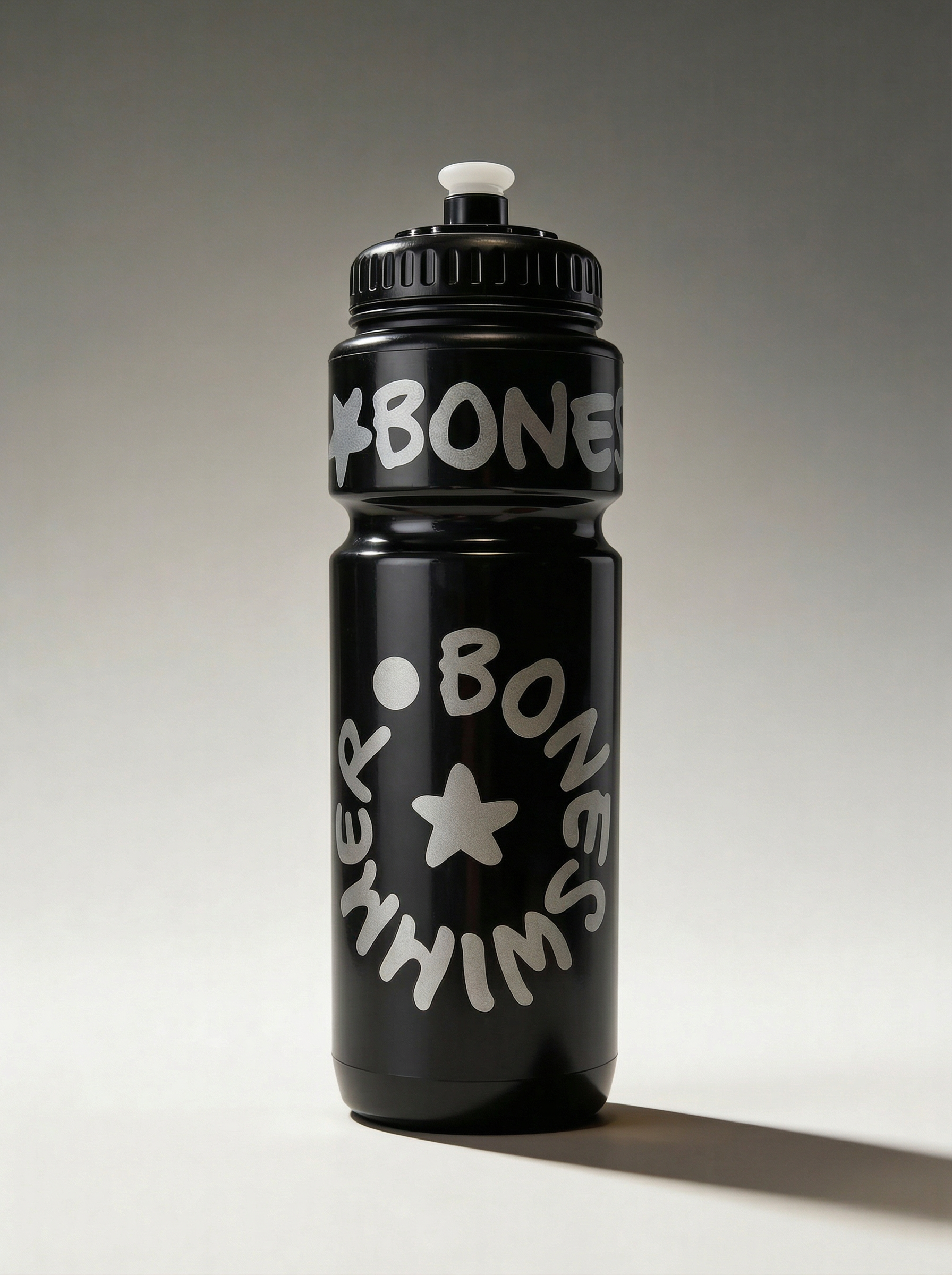 BONESWIMMER Sportflasche mit 750 ml Fassungsvermögen, schwarz mit silbernem Kontrastlogo. Eine klare Schlichtheit mit starker grafischer Präsenz: gedacht für alle, die Leistung mit Stil leben.