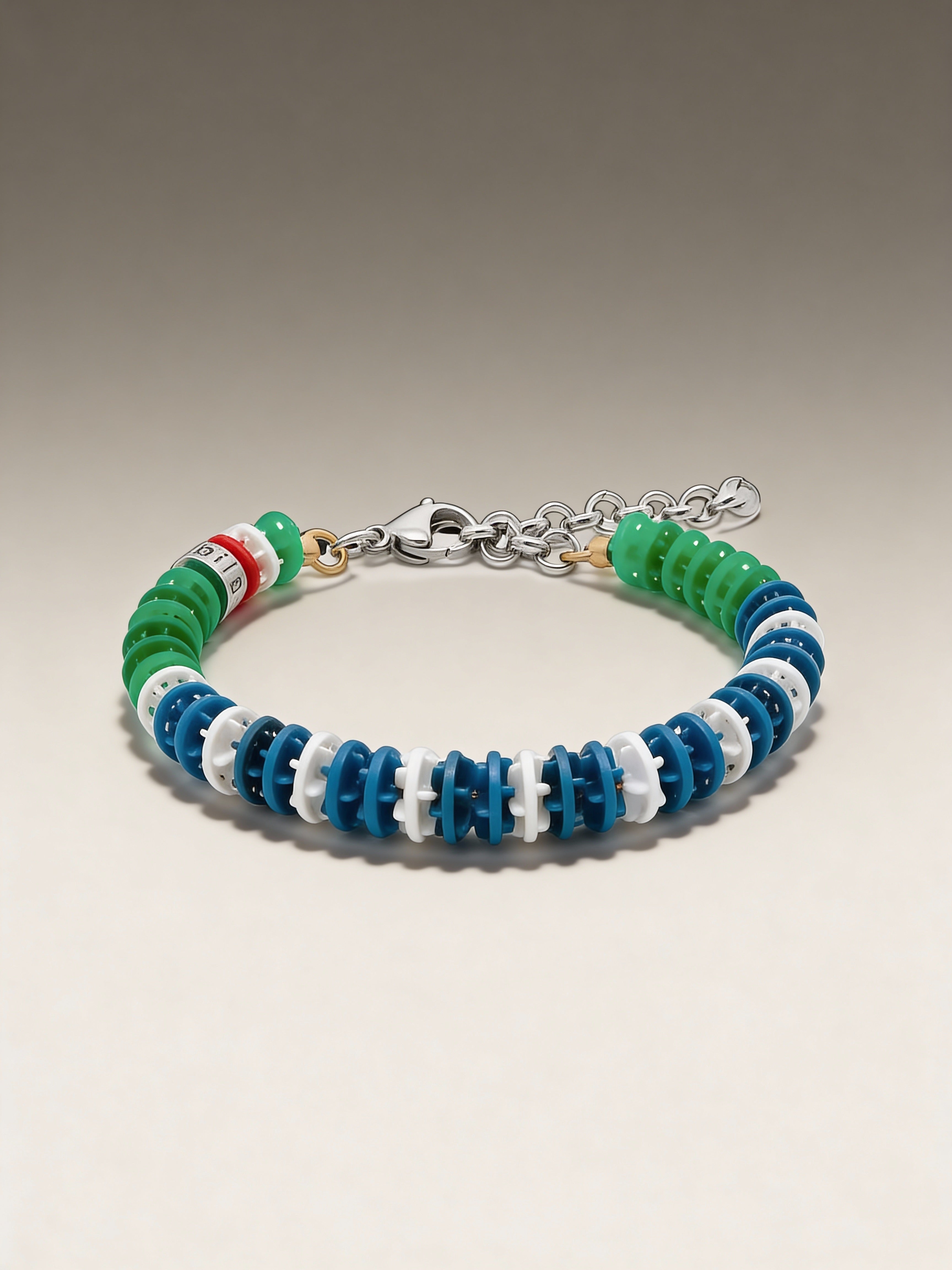 Armband Bahn Sieg 606 BONESWIMMER: vorherrschend blau und weiß mit einem grünen Einsatz, der nahe dem Verschluss Tiefe und Charakter verleiht.