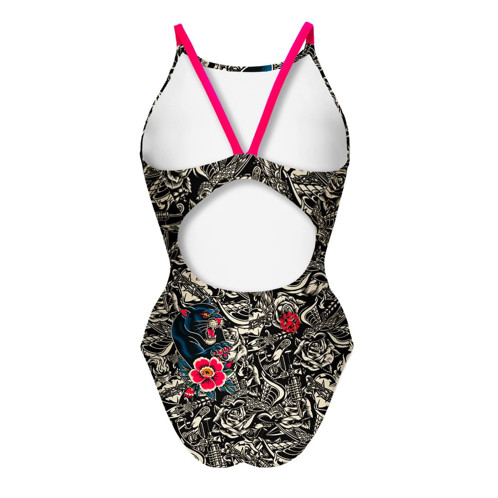Trainings-Einteiler, Modell Ibiza. "Tattoo"-Print: Pop Art, Tattoo-Farbkontrast, Panther mit leuchtend roter Blume.