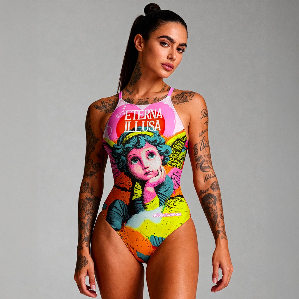 Trainingseinteiler, Modell Ibiza. Druck "Illusa" (Winter 25/26): ein hypnotisches, geometrisches Muster, das mit der Wahrnehmung spielt und einen dynamischen, kühnen visuellen Effekt im Becken erzeugt.