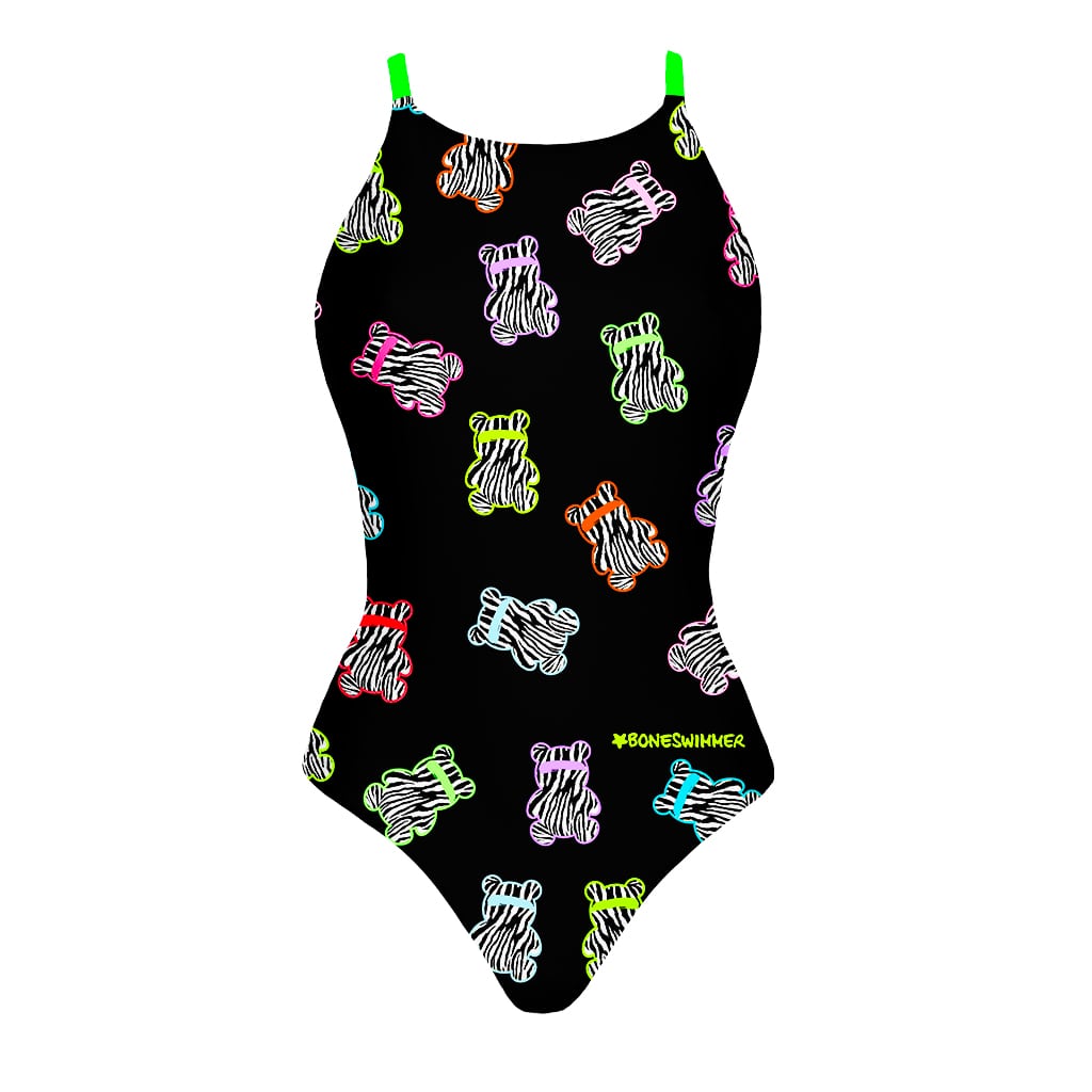 Stil: Grafik mit poppigem und verspieltem Charakter, mit einem Muster aus stilisierten Bärchen im Zebramuster auf schwarzem Grund. Der Stil erinnert an die Ästhetik der Straßenkunst und der Grafiken der 90er Jahre, mit fluoreszierenden Farben und lebhaften Linien, die einen dynamischen Look schaffen. Das Motiv – bunte und ironische Bärchen – verleiht eine lustige und unbeschwerte Note. Diese Kombination aus ansprechendem Design und lebhaftem Druck macht den Anzug nicht nur perfekt für Wettkampfschwimmen und tägliches Training, sondern auch als ikonisches Kleidungsstück, um sich im Becken hervorzuheben.