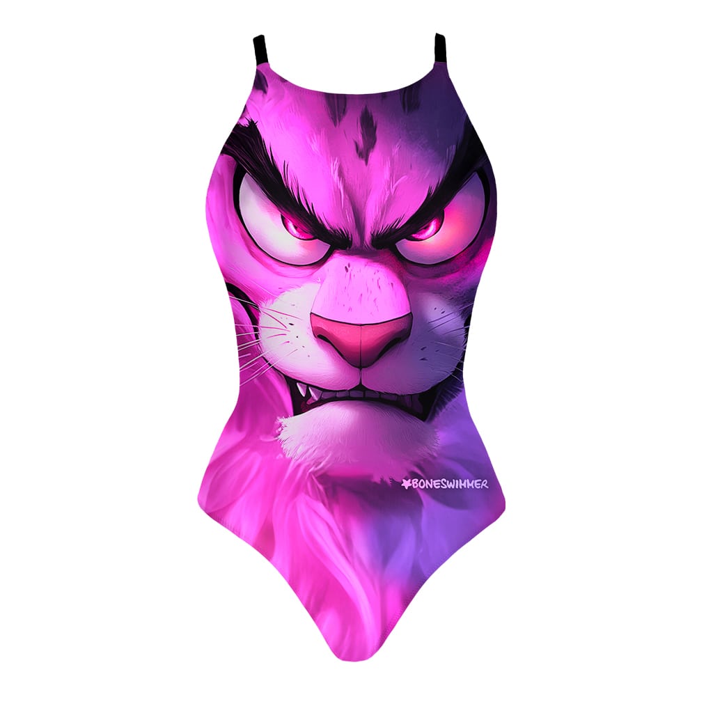 Stil: Trainingsanzug mit einer kühnen Grafik eines rosa Raubtiers im Comicstil, eine Art intensive und kraftvolle rosa Pantherin. Das Design vermittelt Charakter und Originalität, ideal für alle, die sich im Schwimmbecken mit Energie und Selbstsicherheit abheben möchten. Die ergonomische Passform und das chlorbeständige Gewebe machen ihn ideal für Schwimmen und intensives Training. Ein sportlicher und modischer Anzug, der Leistung und Stil vereint.