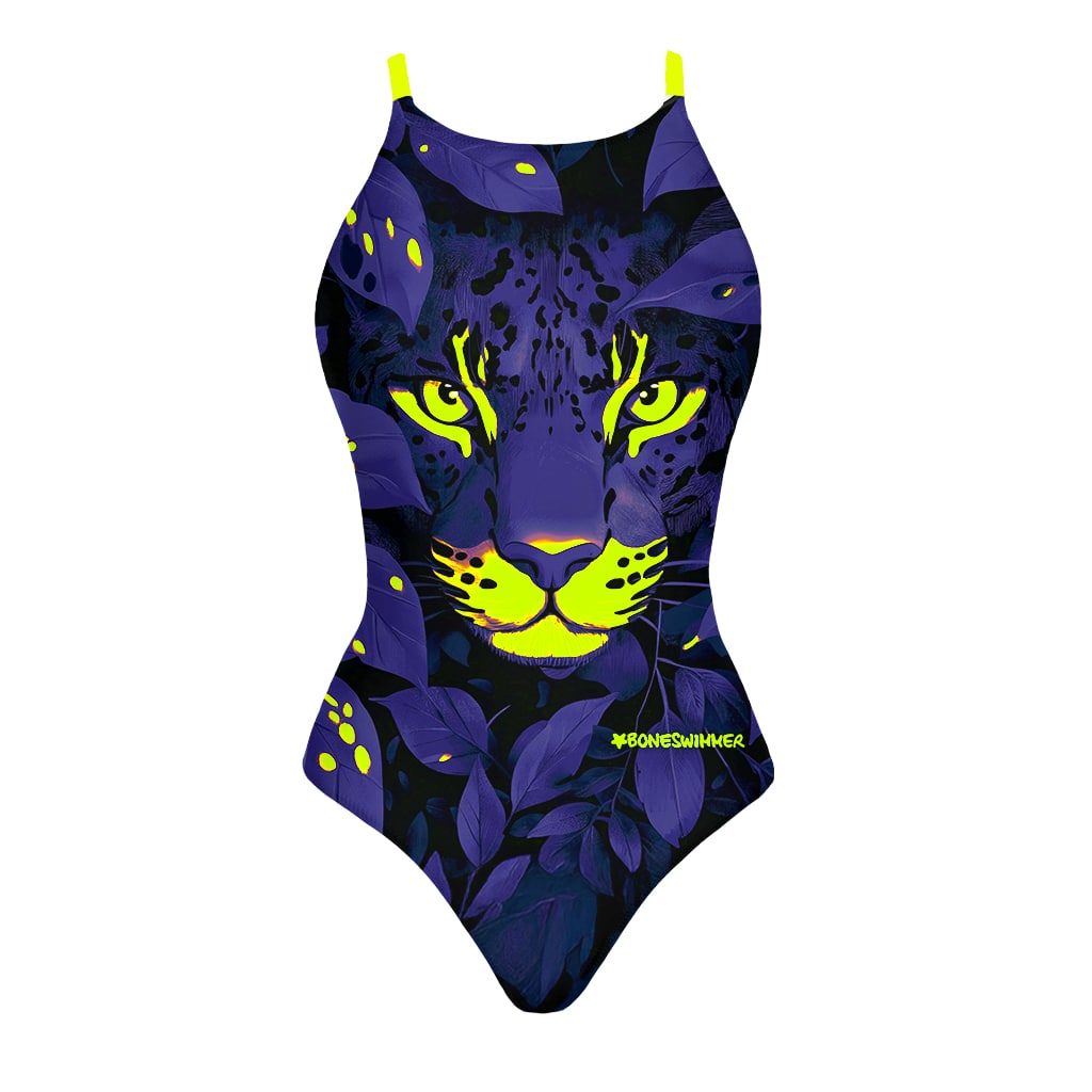 Stil: wilde und geheimnisvolle Energie, mit dem hypnotischen Blick eines fluoreszierenden Leoparden, der Aufmerksamkeit erregt und Charakter zeigt. Die dunklen Bòu-Töne und Neon-Details schaffen eine magnetische und anspruchsvolle Atmosphäre, ideal für alle, die sich auch im Wasser mit einem entschiedenen Stil abheben möchten. Nicht nur ein Schwimmanzug, sondern ein echtes Ausdrucksmittel der Persönlichkeit, das Leistung und Kraft vereint.