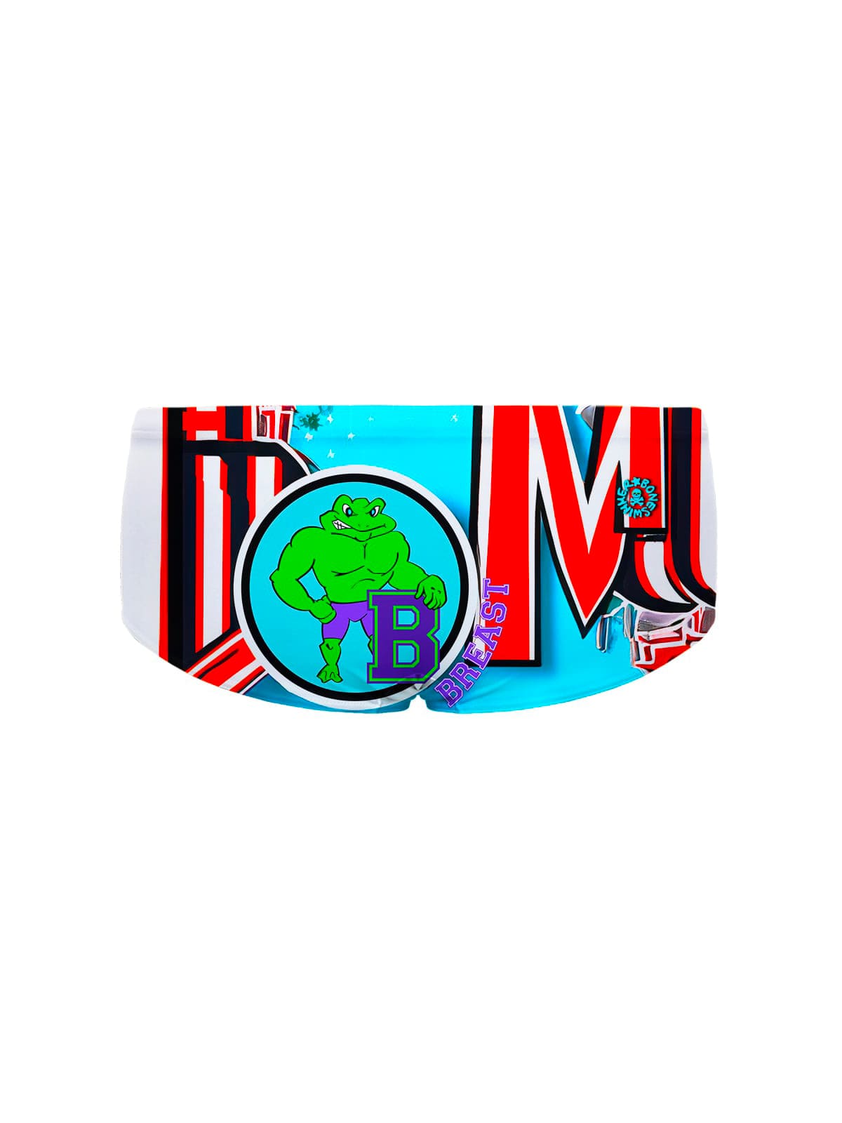 Trainings-Badehose mit Beinschnitt, Modell Ucla. Print "Breast" (Herbst/Winter 25): ein mutiges Design, das die Kraft eines Raubtiers evoziert und dafür gedacht ist, im Becken Eindruck zu hinterlassen.