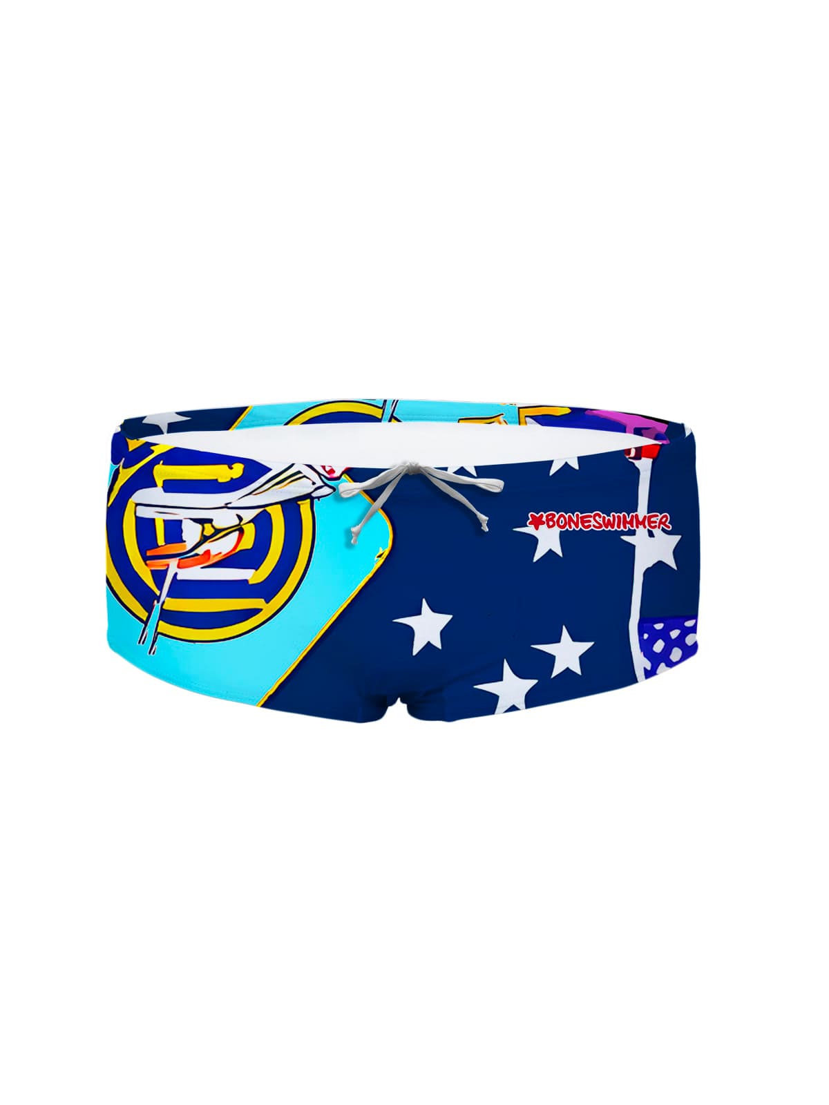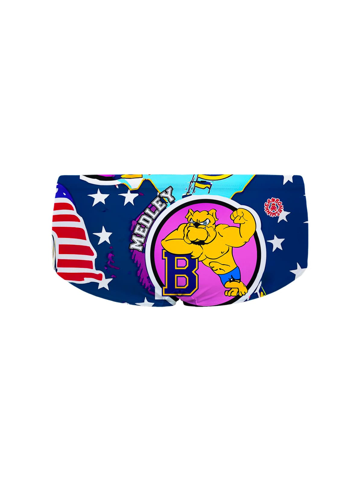 Trainings-Badehose im Parigamba-Stil, Modell Ucla. Print "Medley": eine Mischung aus markanten Grafiken und kontrastreichen Farben für explosive Energie im Becken, inspiriert von der College-Ästhetik der USA.