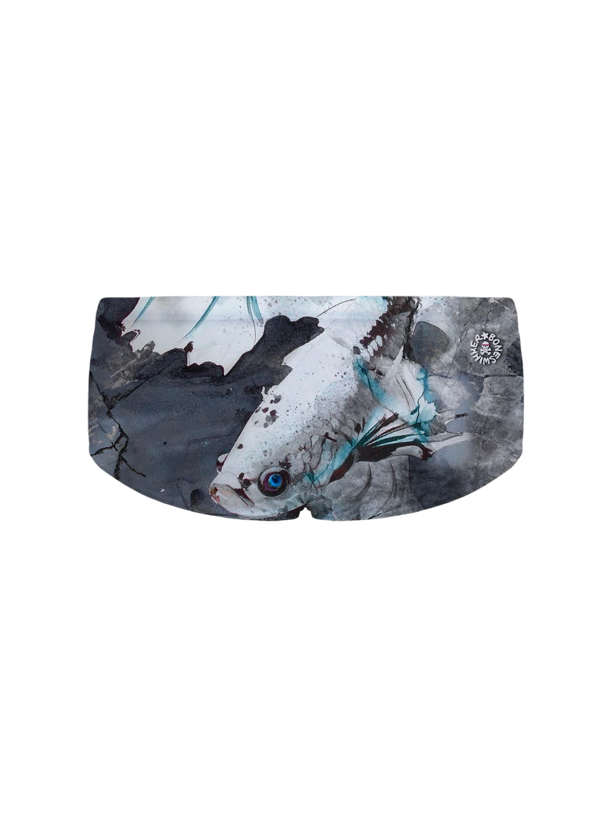 Trainingsboxer, Modell Ucla. Druck "Raku": ein abstraktes Design mit schwarzen und grauen Pinselstrichen auf weißem Grund, inspiriert von japanischer Keramik, für einen eleganten und kraftvollen Auftritt im Becken.