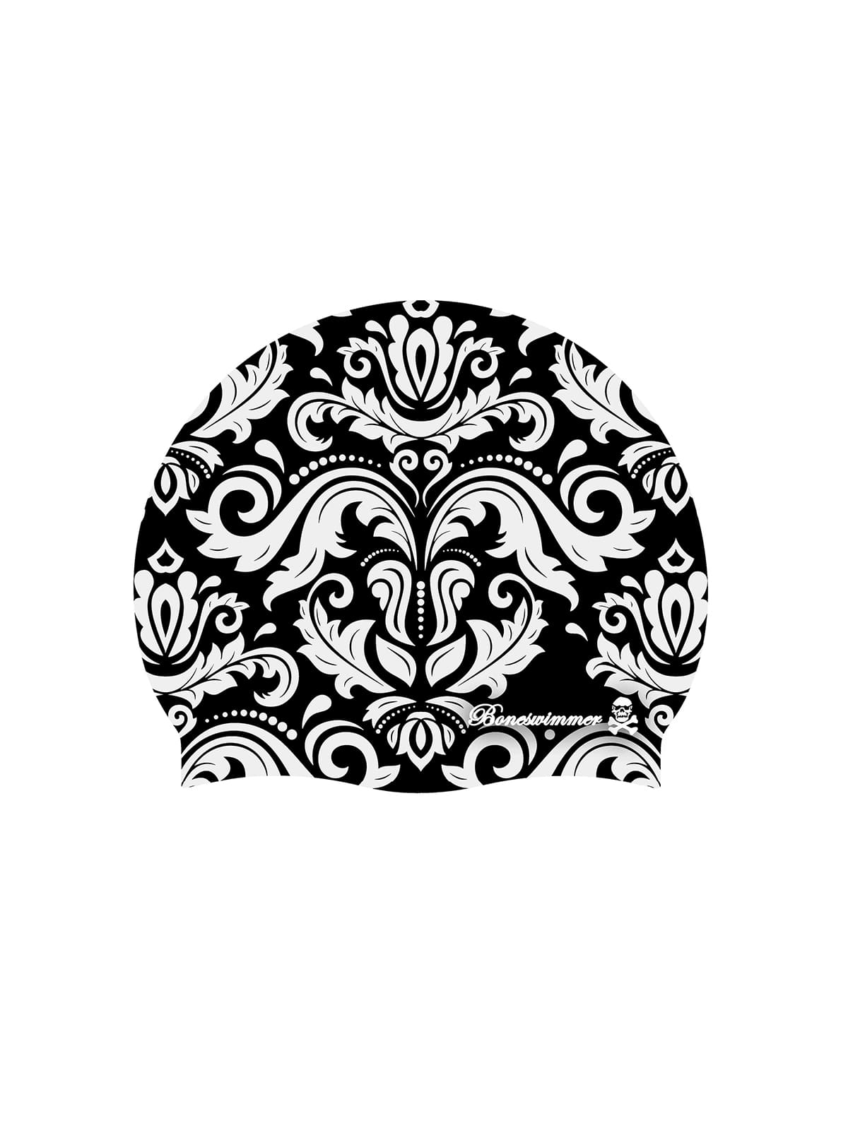 Schwimmkappe aus dickem Silikon, schwarzer Hintergrund mit optisch weißem Damastmuster, passend zu unseren unkonventionellen Badeanzügen.
