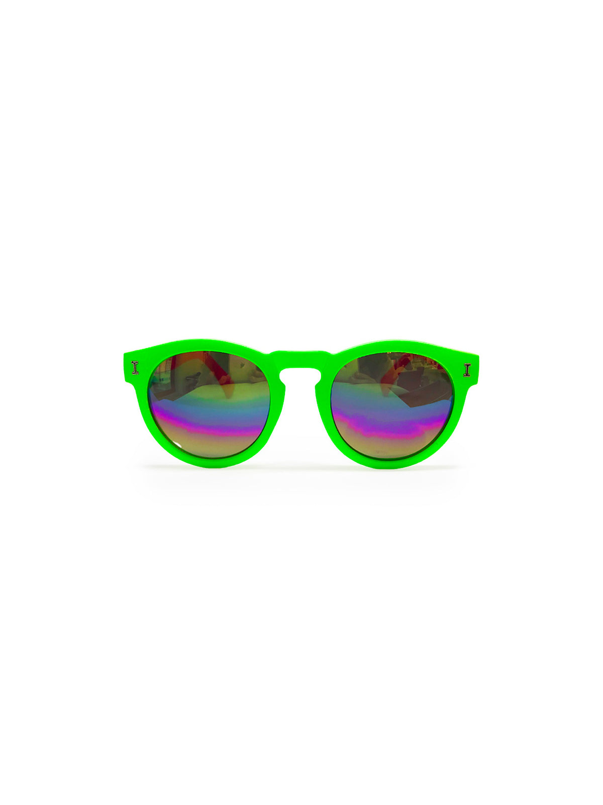 Runde Sonnenbrillen in Neon-Grün und Neon-Fuchsia von BONESWIMMER mit verspiegelter Rainbow-Linse und UV400-Schutz.