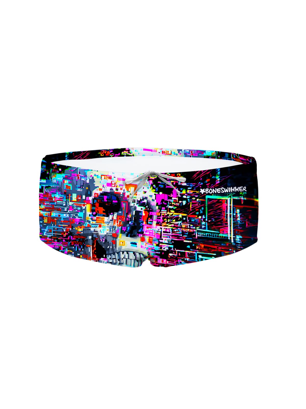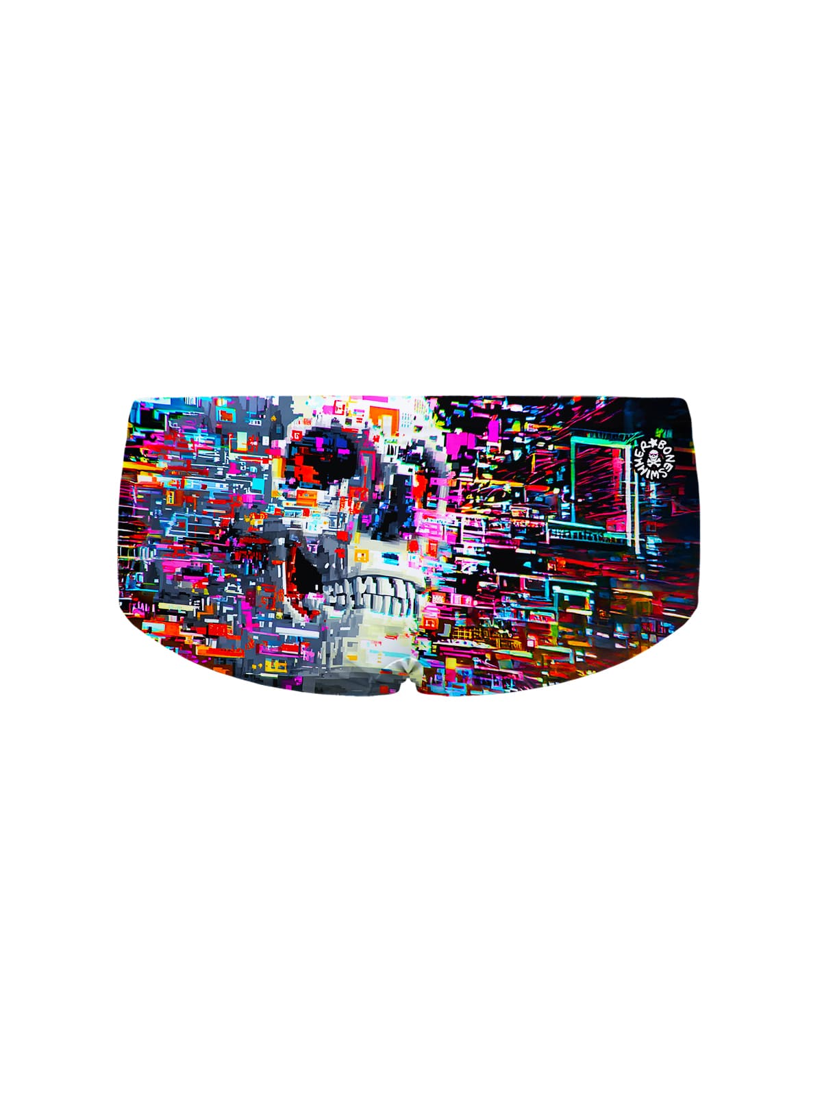 Trainingsboxershorts, Modell Ucla. „Glitch“-Druck: digitale Ikone, Glitch-Kunst, futuristischer Cyber-Schädel.