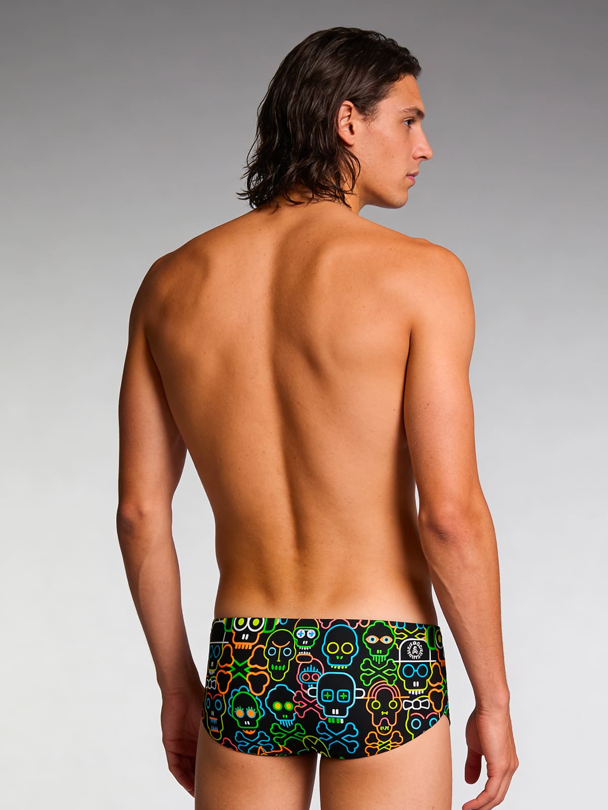 Der intensive schwarze Hintergrund erwacht mit farbenfrohen Totenköpfen in vielfältigen Formen zum Leben. Lebendige und intensive Farben sind die Wahl für diejenigen, die sich stilvoll abheben möchten, indem sie sich mit klaren, aber wirkungsvollen Linien von der Masse abheben. Ein Muster, das darauf ausgelegt ist, beim ersten Wendemanöver Aufmerksamkeit zu erregen, im pop-fluoreszierenden Stil.
