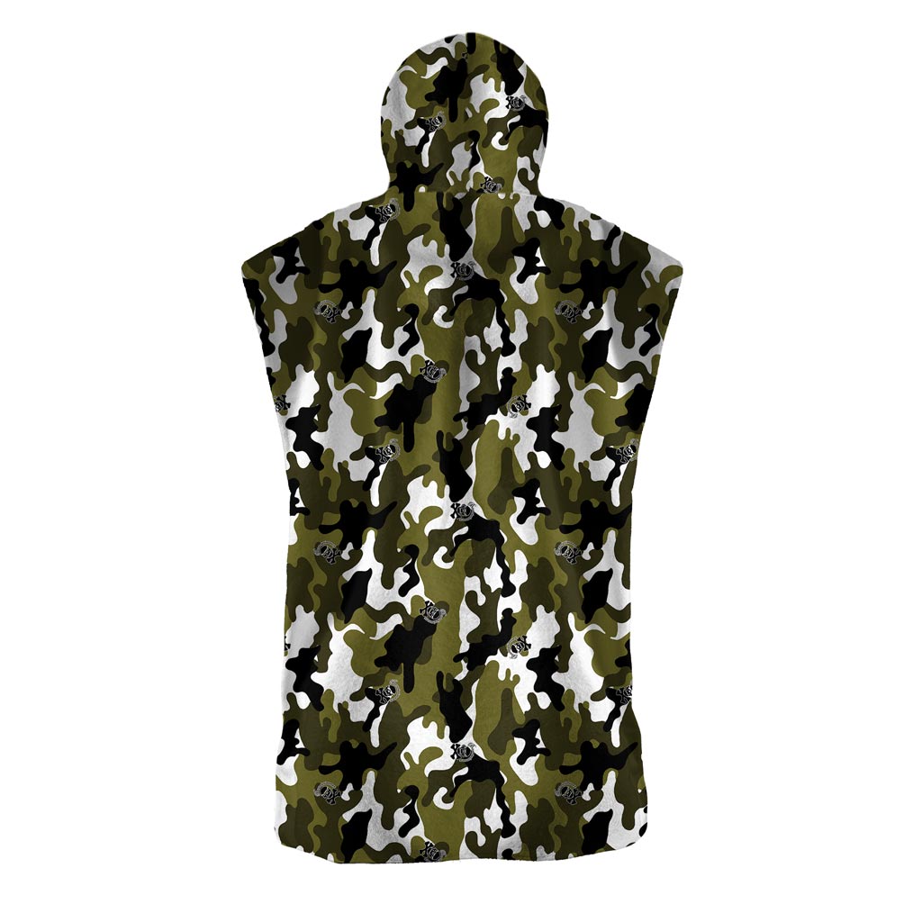 BONESWIMMER Poncho aus Mikrofaser, Druck 5PO-MILITARE. Umschließend und praktisch zum Umziehen am Beckenrand, mit Kapuze und Fronttasche.