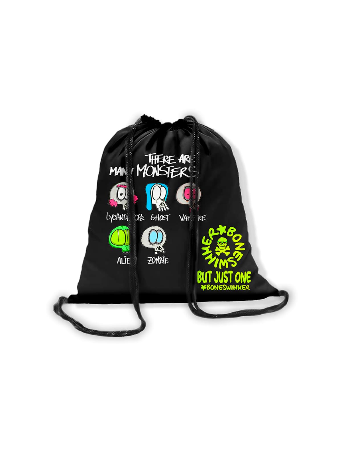 Rucksackbeutel aus Mikrofaser BONESWIMMER, Monster-Druck. Perfekt, um alles Wesentliche am Beckenrand zu verstauen, mit Kordelzugverschluss und verstellbaren Schulterriemen.